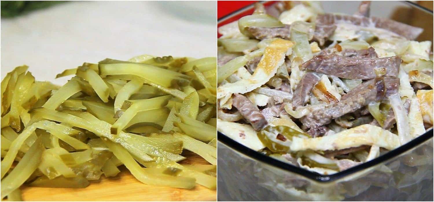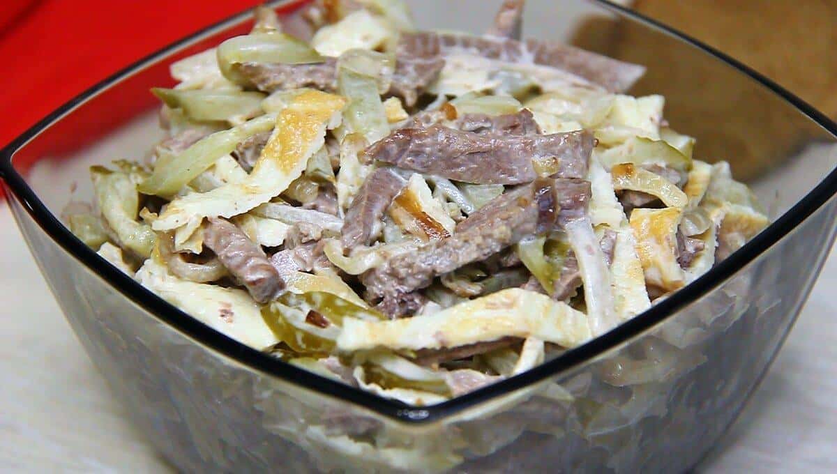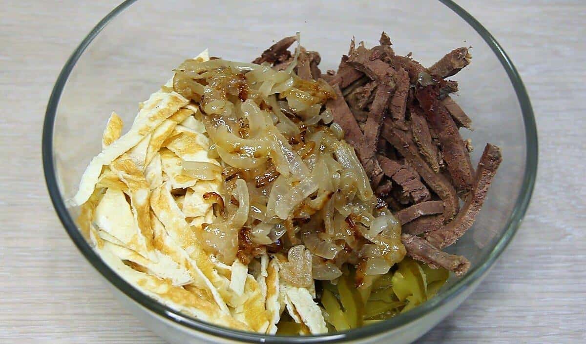 Ситний і смачний салат “Міністерський” з яловичиною і яєчними млинцями. Його можна приготувати на вечерю і навіть святковий стіл. Готується просто і швидко.