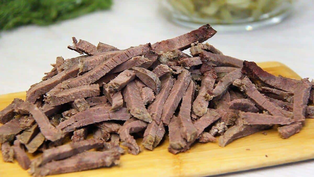 Заздалегідь відварену і охолоджену яловичину розділіть на волокна або також наріжте соломкою.