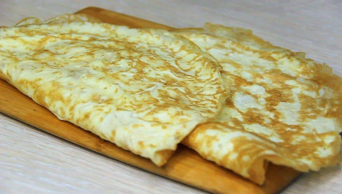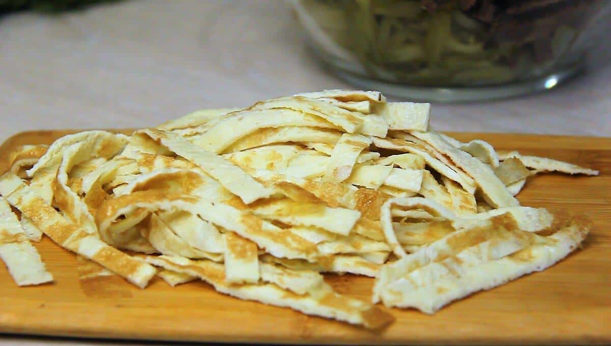 Готові яєчні млинчики поверніть трубочкою і наріжте тонкою соломкою.