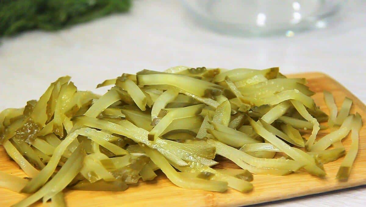 Мариновані огірки наріжте соломкою.