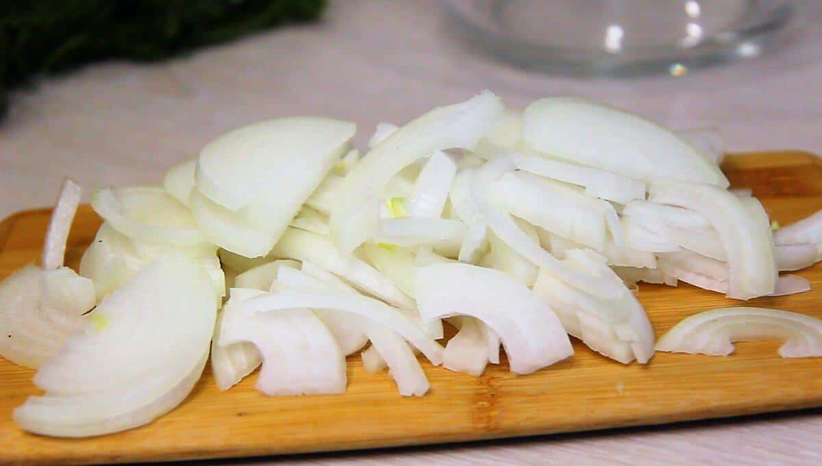 Ріпчасту цибулю наріжте напівкільцями і обсмажте на невеликій кількості олії, до м’якості і золотистого кольору.