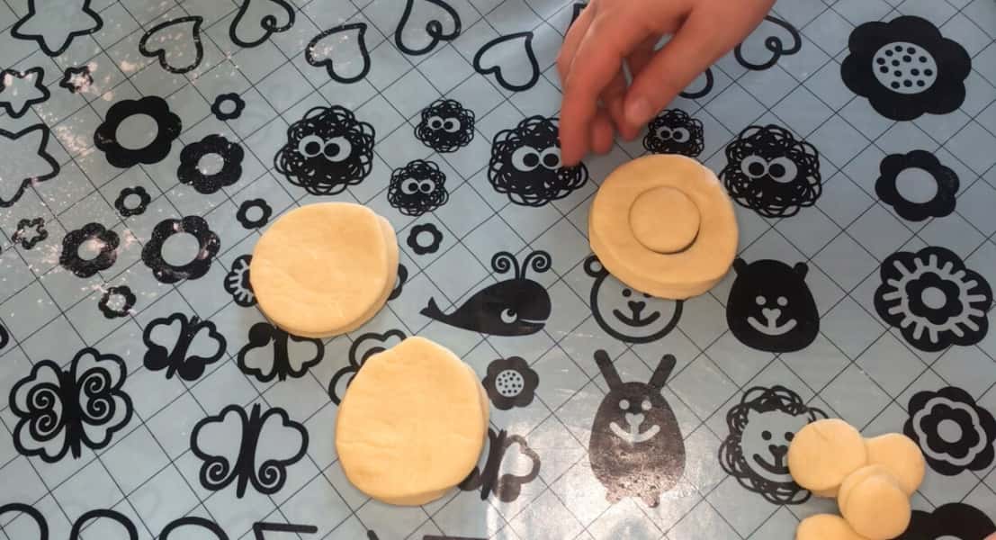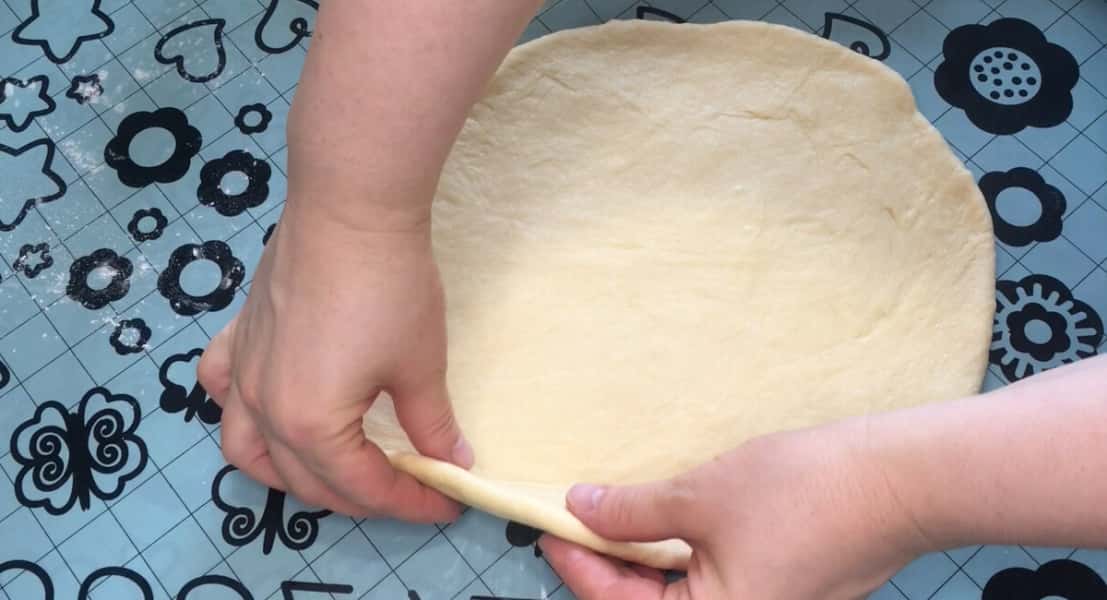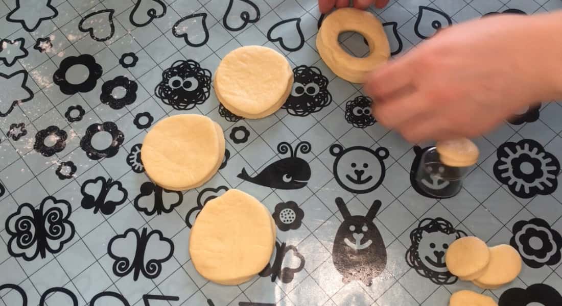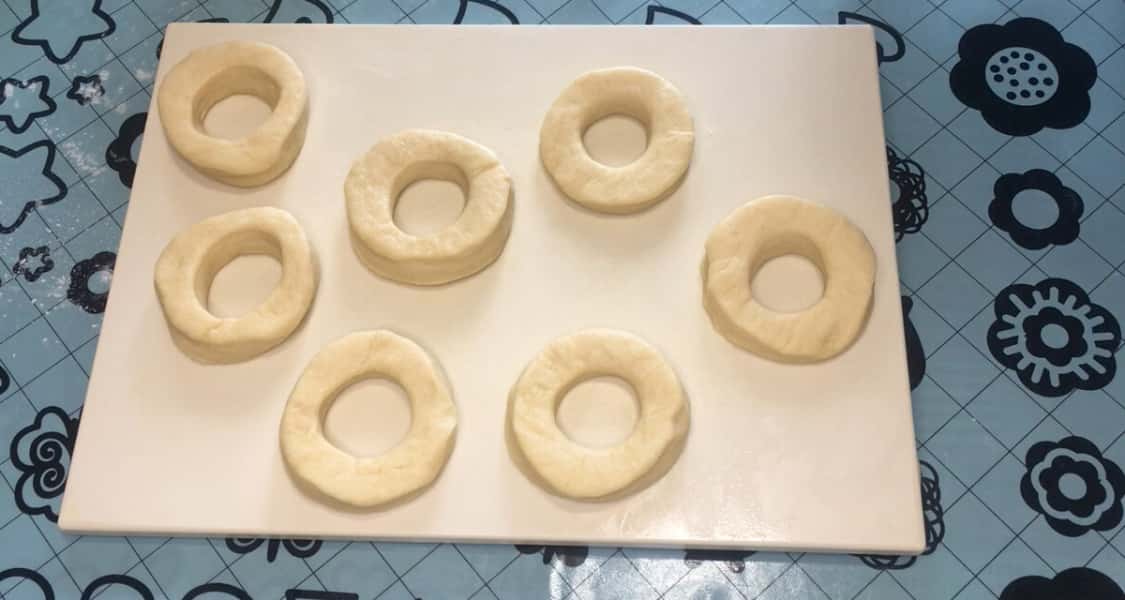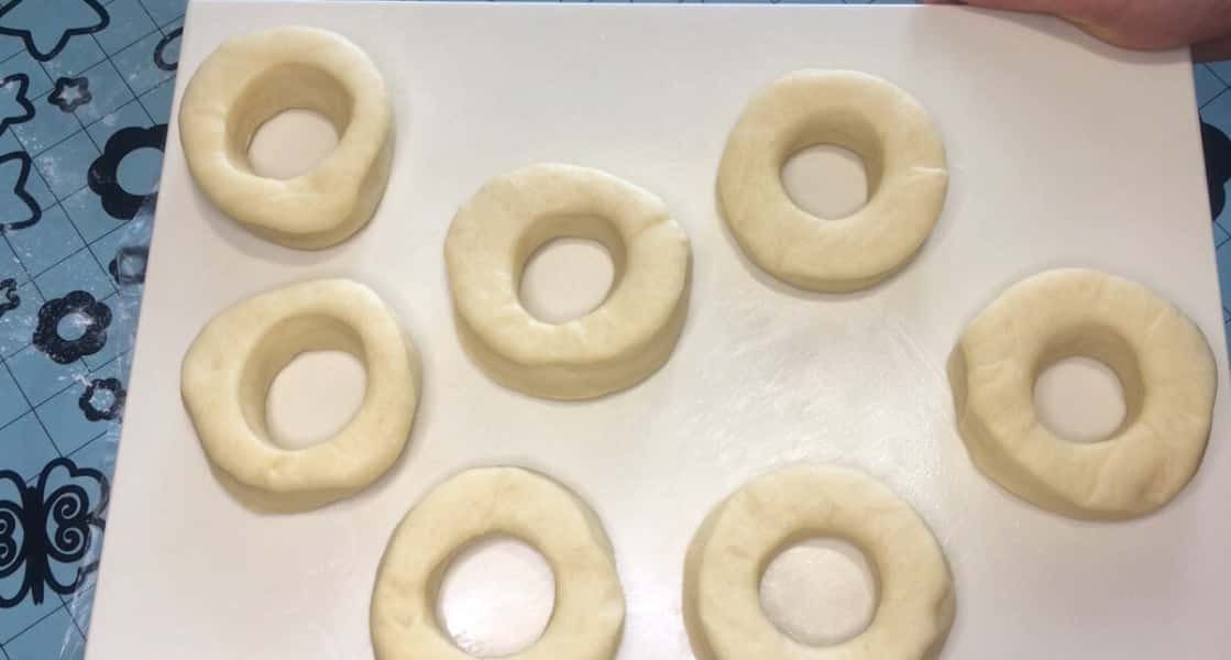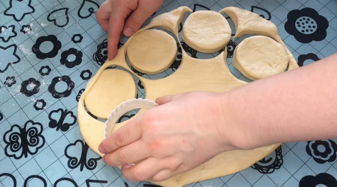 Тісто добре підійшло, злегка обминаємо, розгортаємо в пласт товщиною 1 см і вирізаємо кружечки діаметром 8 см, в середині також вирізаємо кружечки діаметром 2 см. Заготівлі накриваємо та ставимо на вистоювання на 15-20 хвилин.