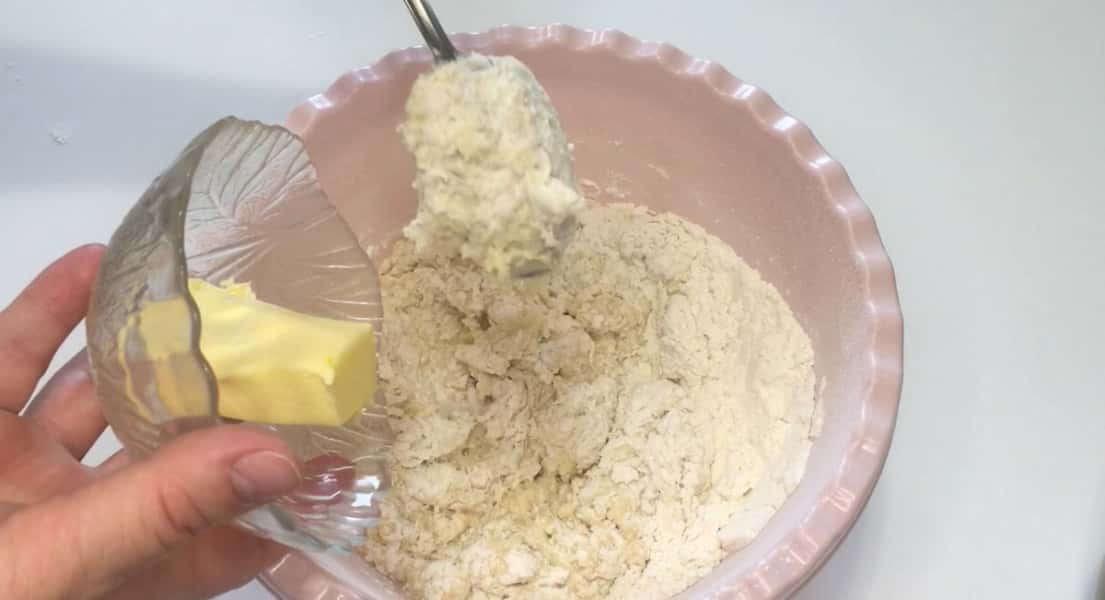 Борошно увібрало всю рідину, додаємо 40 г м’якого вершкового масла і вмішуємо в тісто.