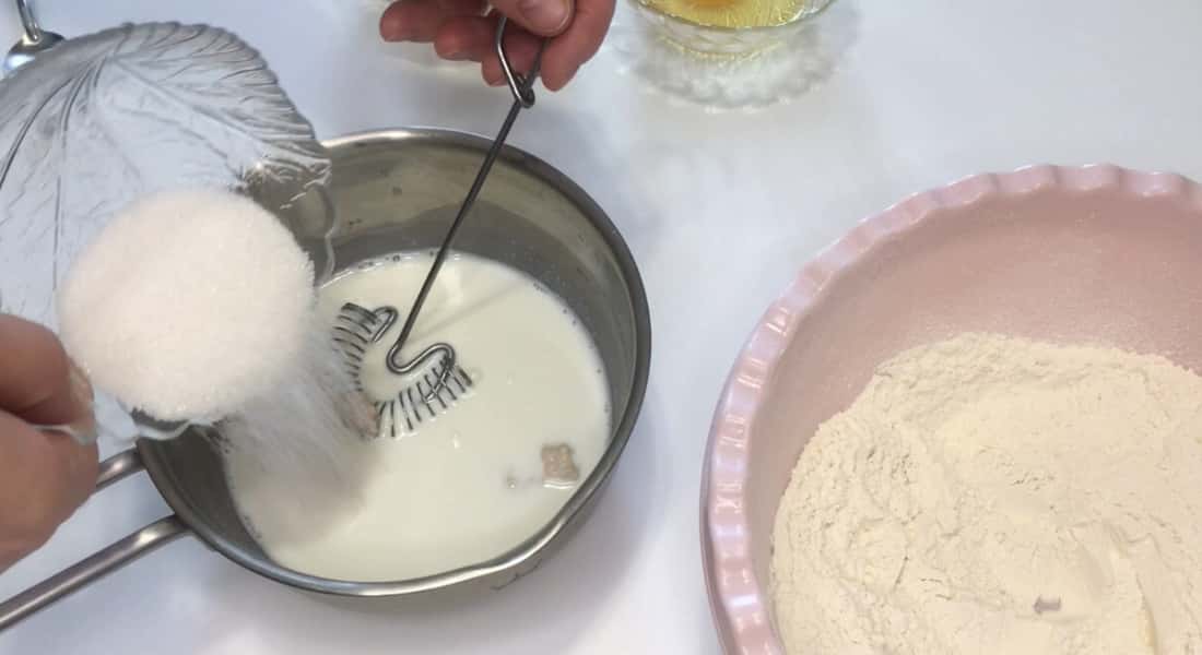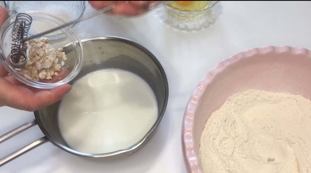 У 150 мл теплого молока ( температурою 36-38 градусів) відправляємо 8 г живих дріжджів, додаємо 2 ст л цукру, за бажанням можна додати ванільний цукор, розмішуємо, щоб дріжджі розійшлися. Потім додаємо 1 яйце і злегка збовтаємо.