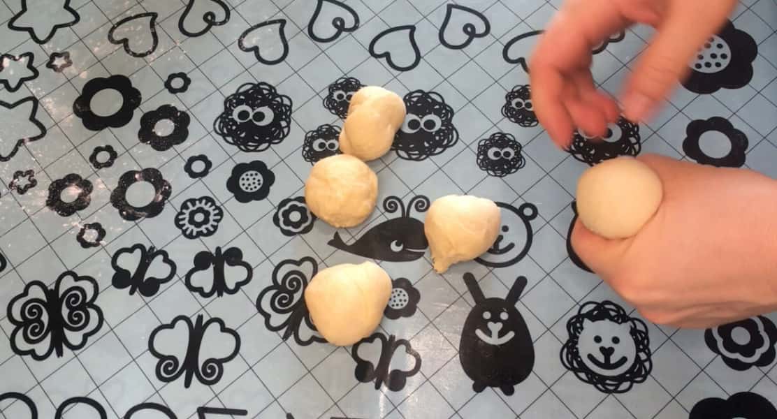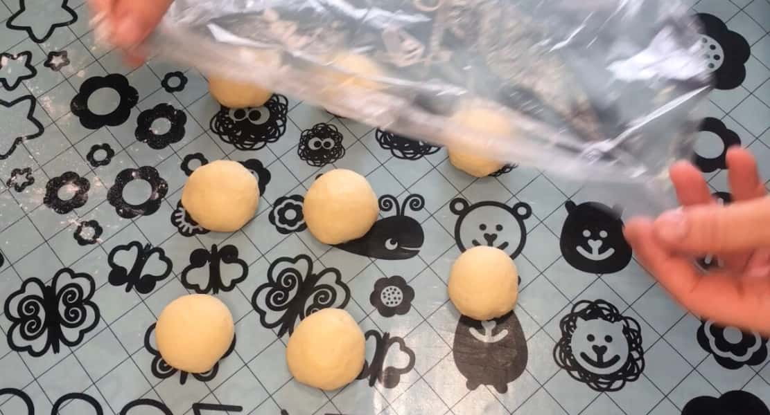 Обрізки тіста збираємо в кулю, підмішуємо даємо тісту відпочити 5 хвилин, щоб воно стало м’якшим і легше стало з ним працювати. Ділимо тісто на шматочки, підкачуємо в кульки і даємо відстояти 15 хвилин.