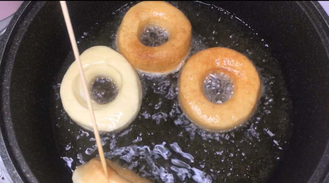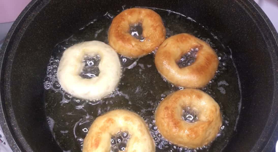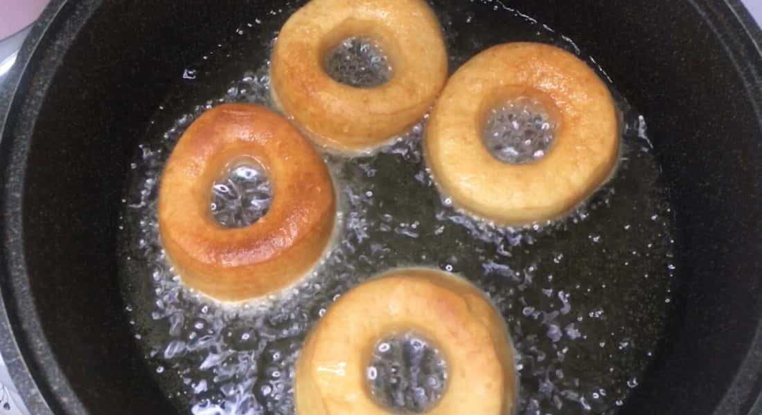 Заготовки добре піднялися, починаємо смажити пончики. У сковорідку наливаємо 0,5 літра олії добре нагріваємо і відправляємо туди наші заготовки.