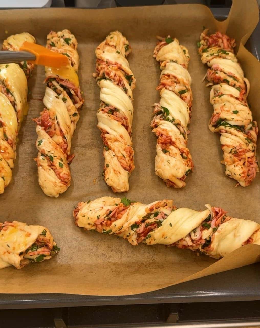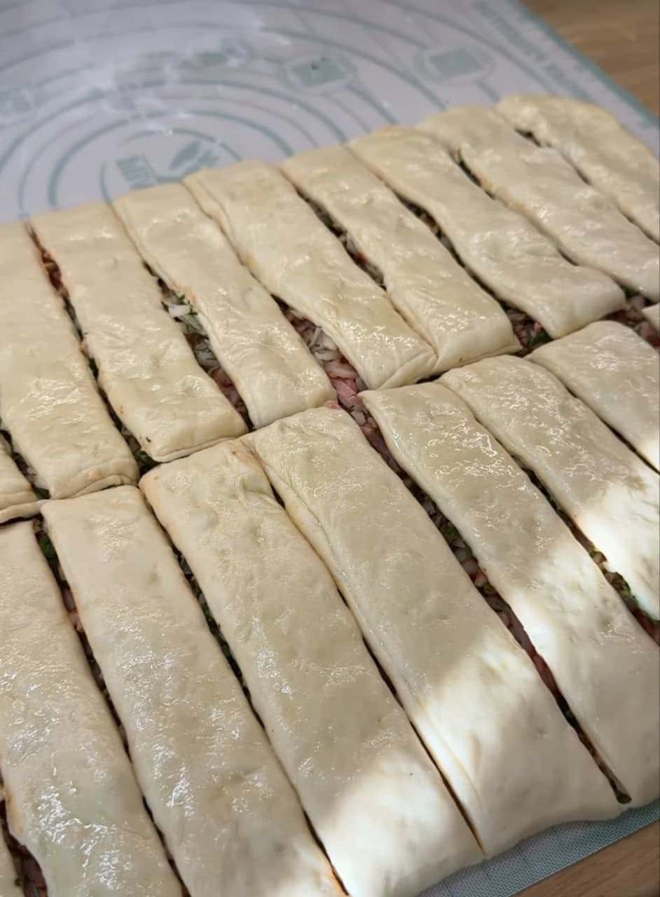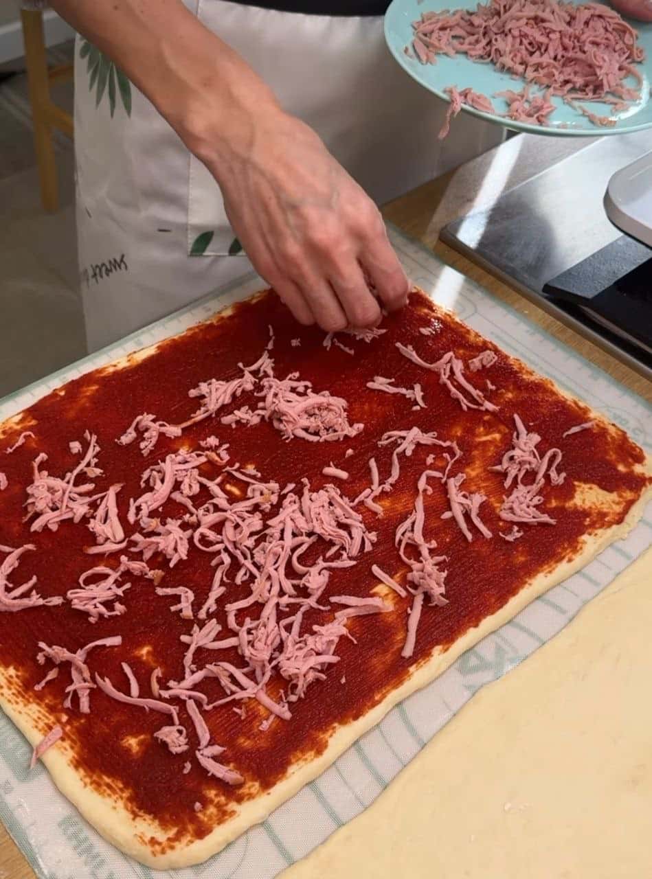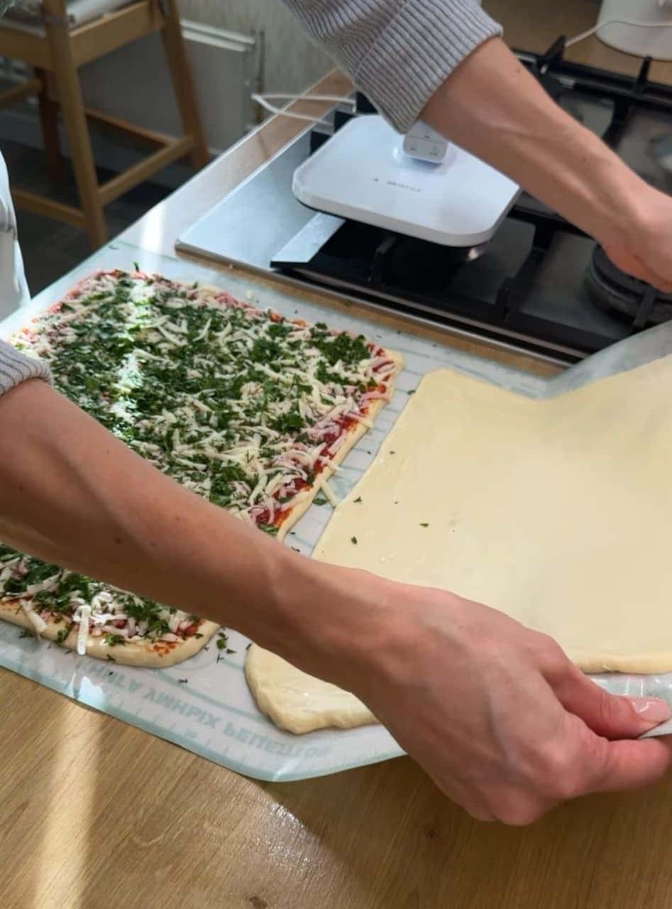 Одну частину тіста змащуємо пастою, посипаємо – ковбаса, сир, зелень.