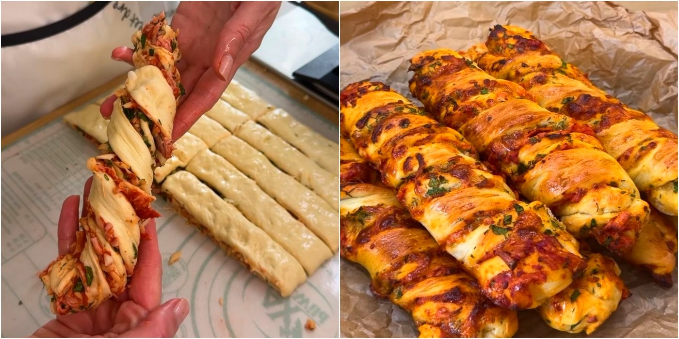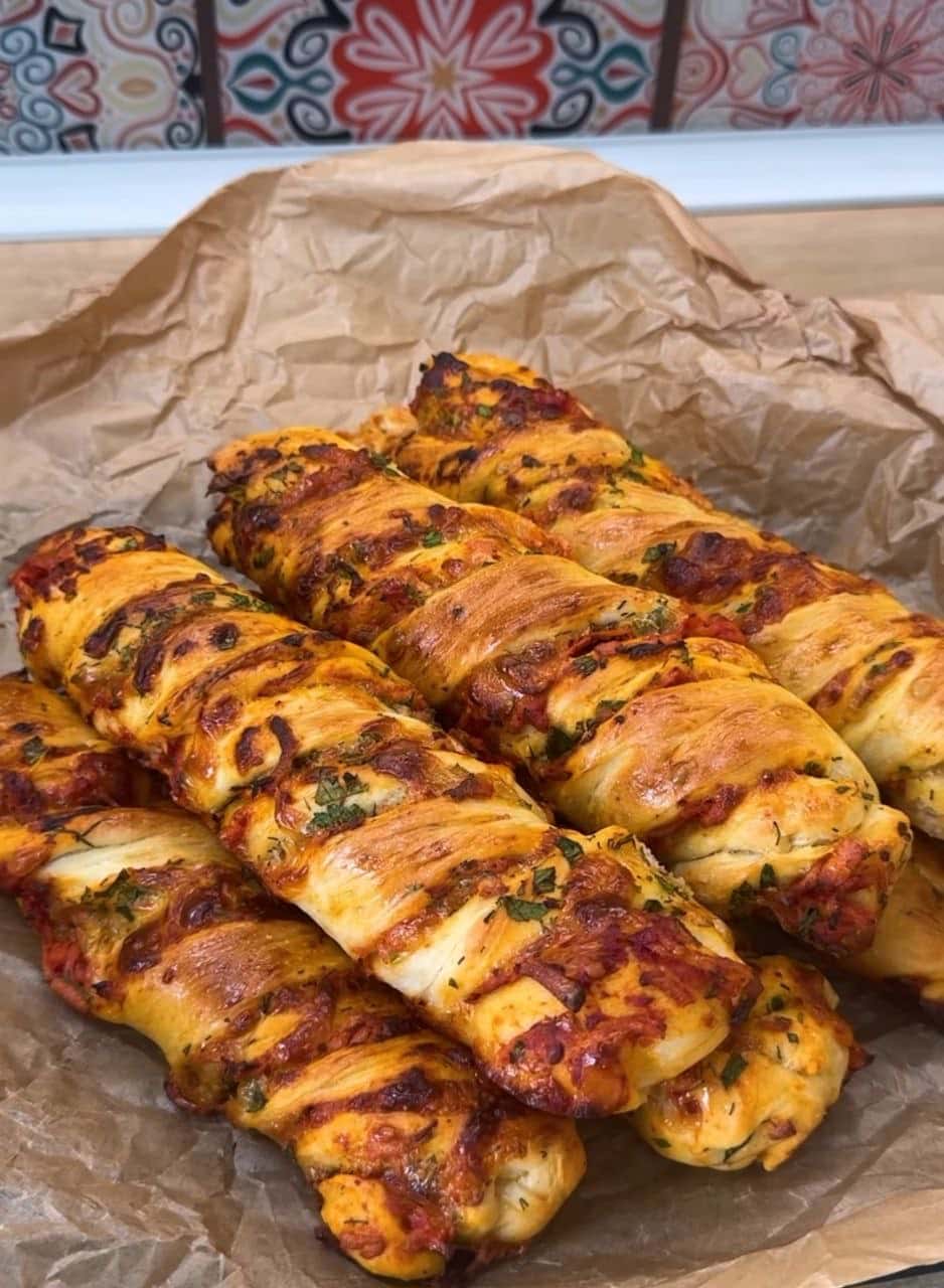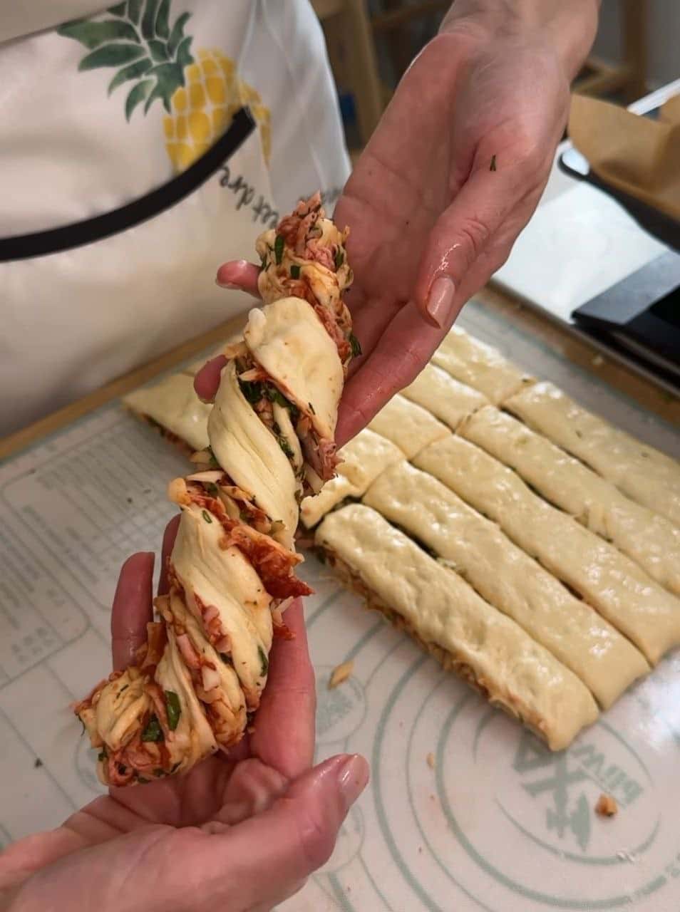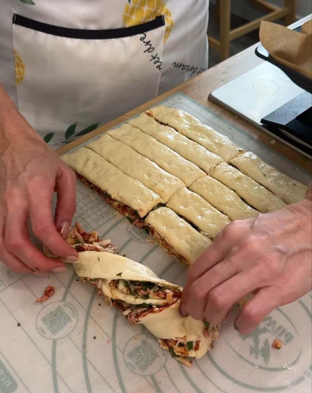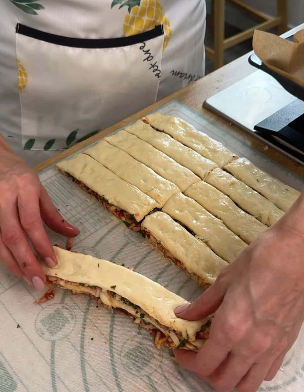 Одну частину тіста змащуємо пастою, посипаємо – ковбаса, сир, зелень.