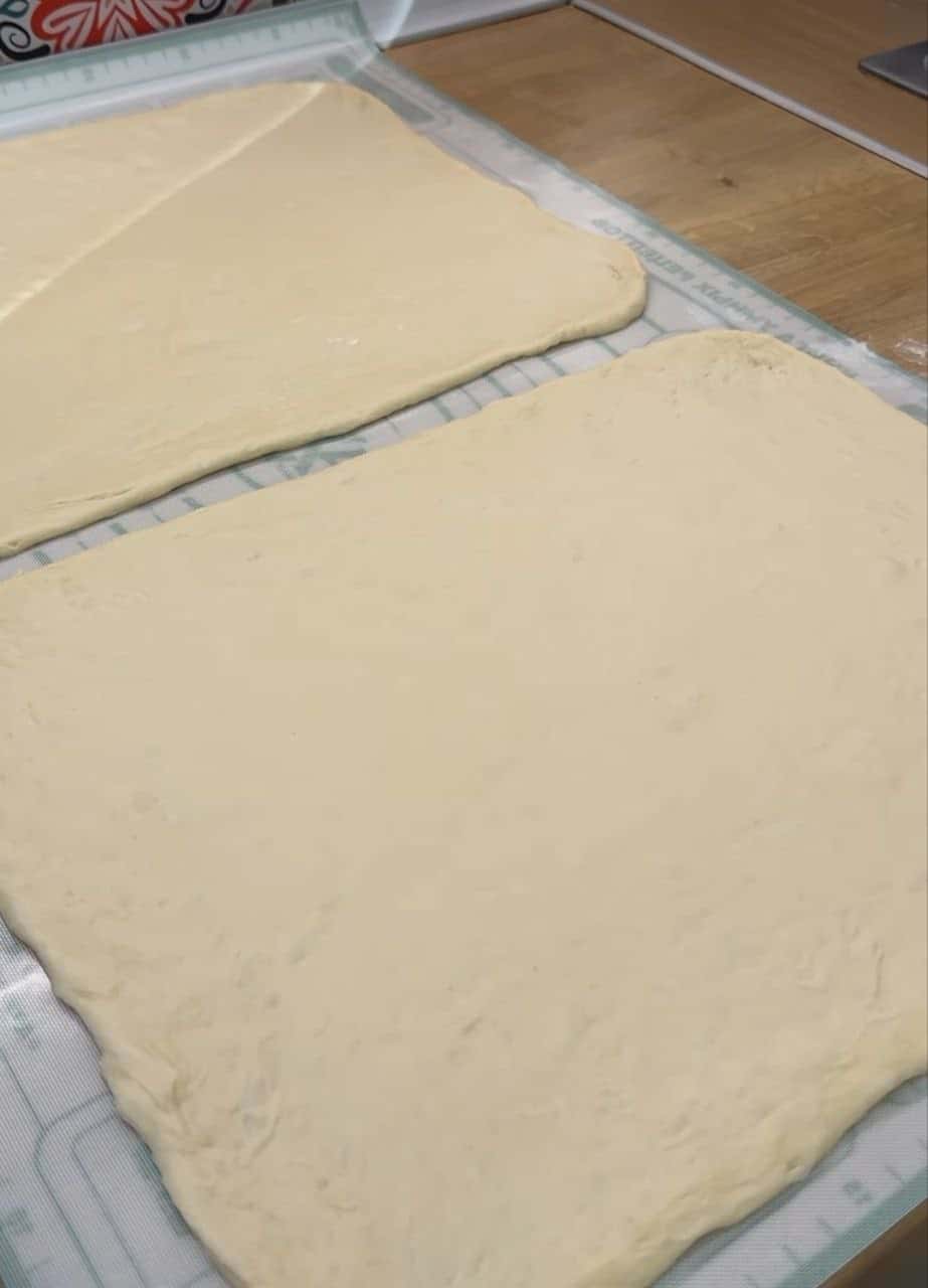 Ділимо тісто на 2 частини, кожну розкачуємо в однаковий пласт.