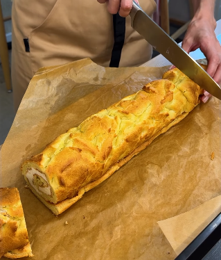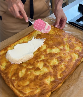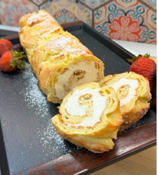 ▫️Корж перевертаємо, змащуємо кремом, згортаємо в рулет.
