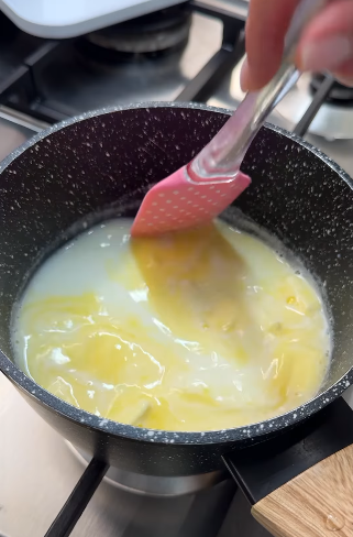 ▫️З’єднуємо молоко, воду, сіль, цукор, ставимо на вогонь.