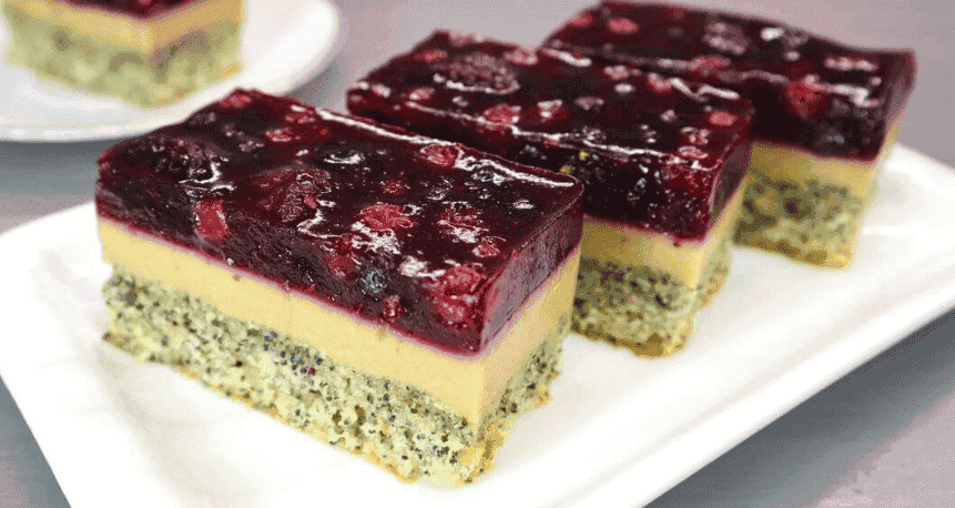Давно хотіла приготувати маковий пляцок, все обмірковувала, яке поєднання смаків та текстур підібрати. Зрештою народився цей простий, але дуже смачний десерт. В основі пляцка маковий бісквіт. На бісквіті вдало розташувався медовий крем з ніжною текстурою і виразним медовим смаком. Завершує ягідне желе. Я використовувала ягідне асорті. Рекомендую брати ягоди з кислинкою: смородину, журавлину чи брусницю. Вони добре доповнять медовий шар. Сюди чудово підійде зелений або трав’яний чай. Я заварювала зелений чай із жасмином із додаванням гілочки м’яти. Прохолодного осіннього дня – те, що потрібно.