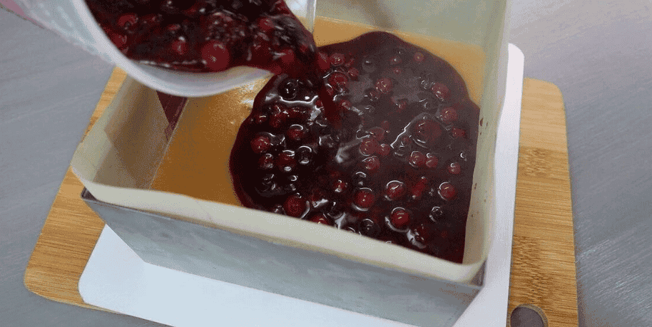 Знімаємо із плити. Додаємо розтоплений желатин. Перемішуємо. Даємо охолонути. Виливаємо ягідну суміш на застиглий медовий крем.