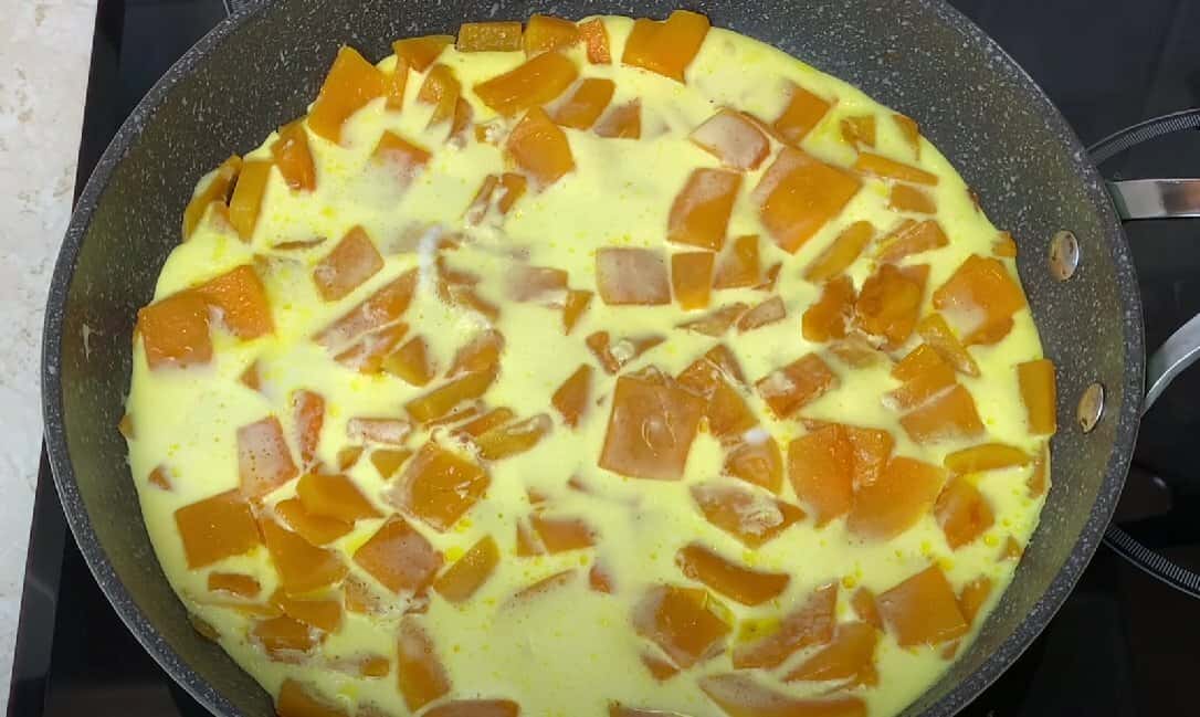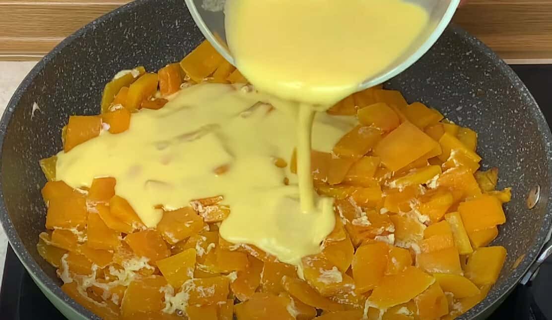Заливаємо гарбуз яєчною сумішшю. Закриваємо сковороду кришкою і готуємо ще кілька хвилин.