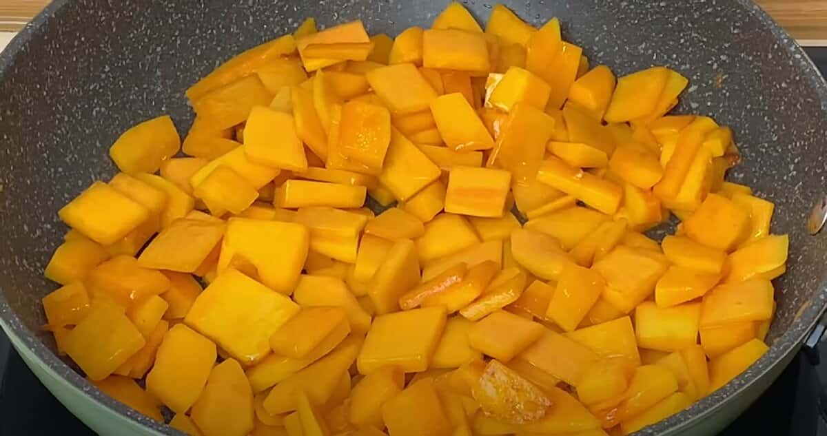 Відправляємо гарбуз на сковороду і обсмажуємо на досить великому вогні пару хвилин.