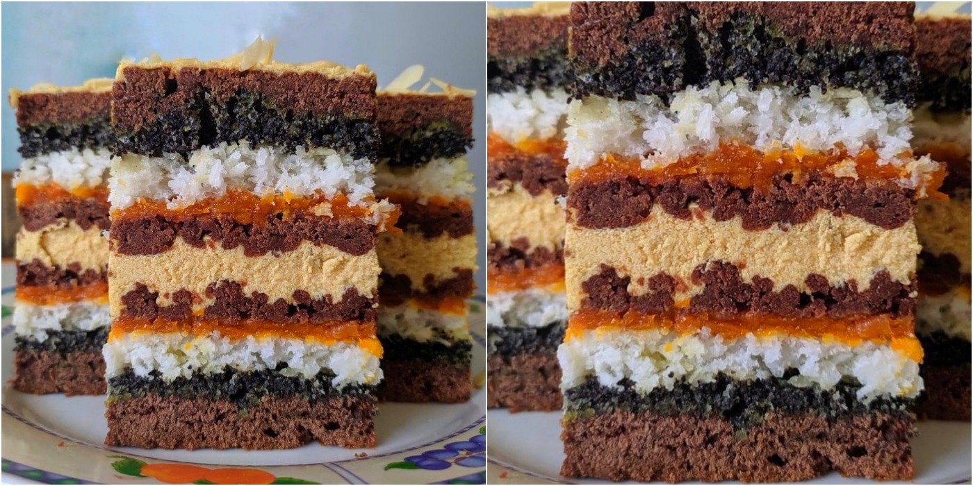 Складаємо корж: у форму, вистелену пергаментом, на крупній тертці натираємо частину тіста, викладаємо макову масу, кокосову, тоді – пюре з кураги.