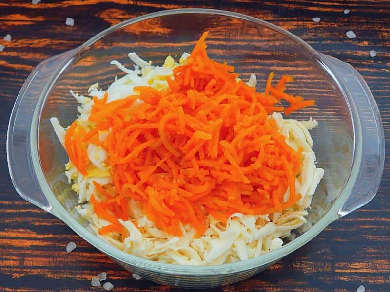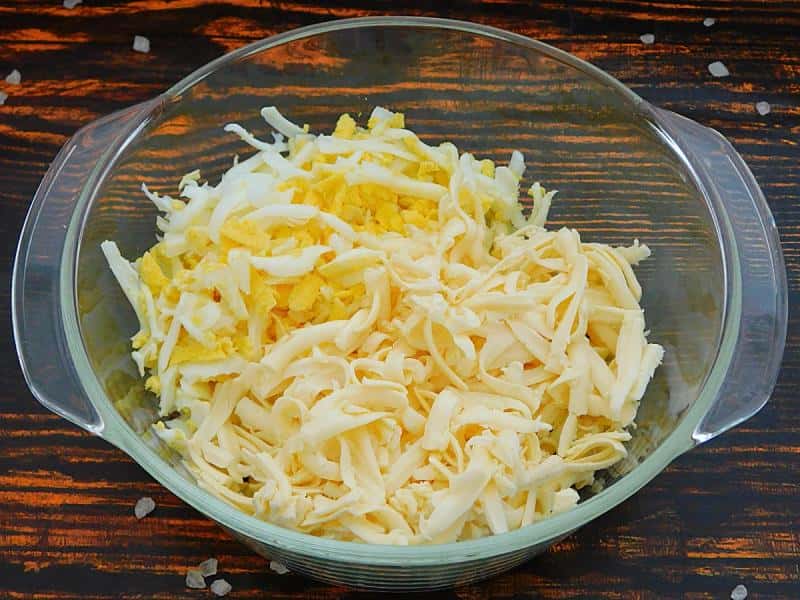 - Плавлений сирок та варені яйця натерти на тертці. Викласти у салатник.