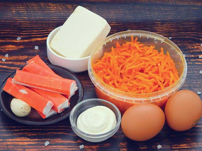 - Підготувати все потрібне. Корейську моркву вибирати без добавок, не гостру. Яйця варити протягом 10 хвилин після закипання, остудити.