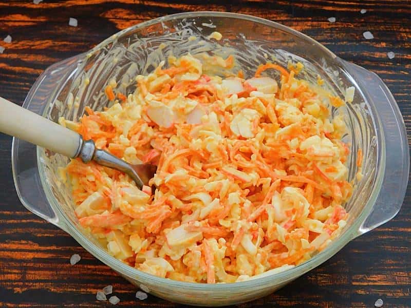 - Перемішати. Так як плавлений сирок злипається, то простежити, щоб його грудочки подрібнилися і розподілилися по всьому об’єму. Спробувати, залежно від смаку та пікантності корейської моркви, комусь може знадобитися додати трохи солі.