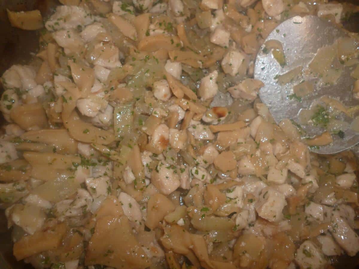 Для начинки дрібно нарізаємо цибулю і ставимо її обсмажуватися, підсмажуємо до золотистого кольору. А потім додаємо до неї порізані дрібними кубиками куряче філе і шампіньйони. Смажимо все разом до випаровування рідини. Приправляємо сіллю і перцем. Можна при бажанні додати якісь сухі травички за смаком.