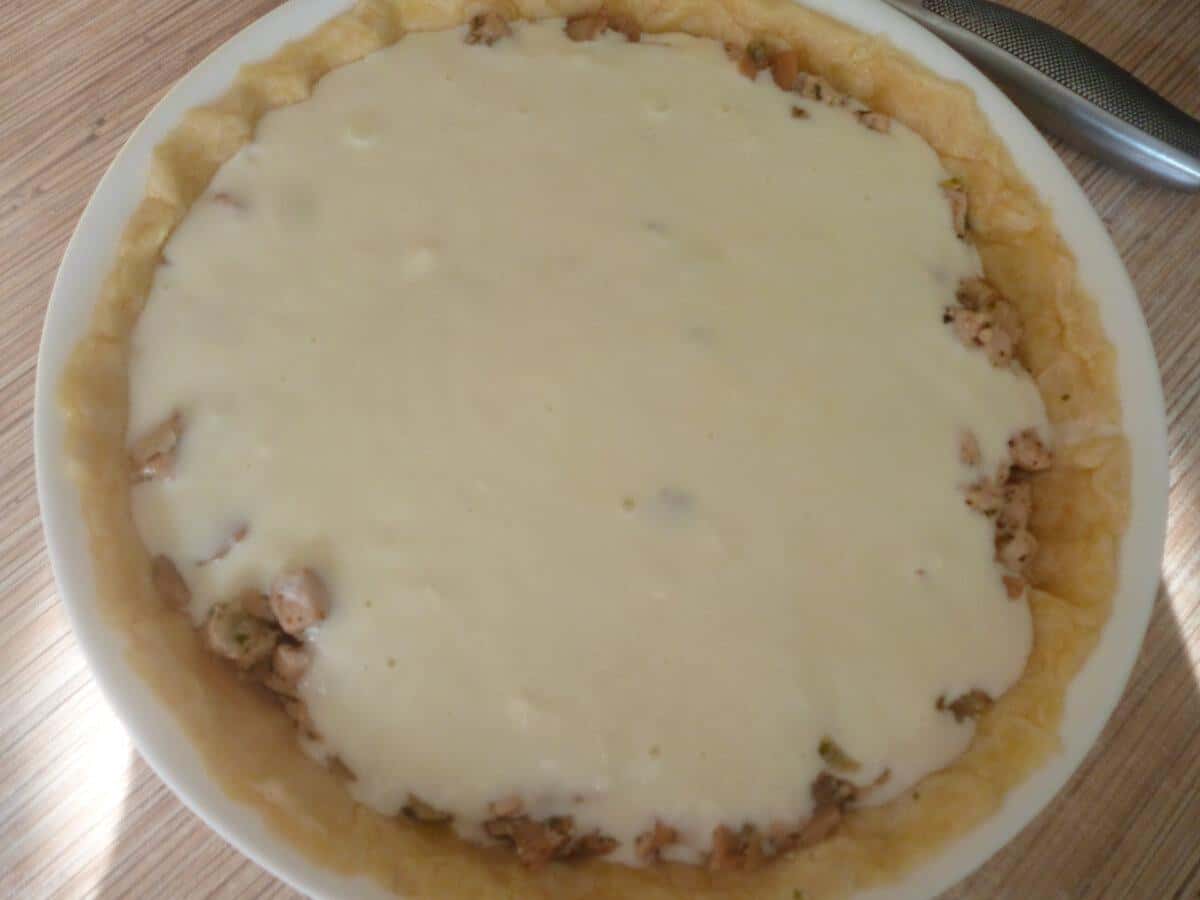 Викладаємо всю начинку і заливаємо її заливкою.