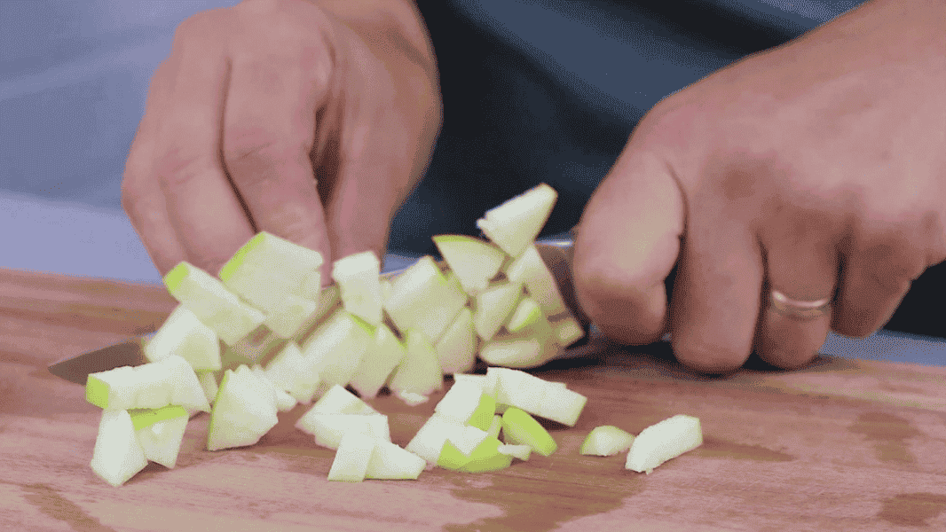 - Також нам знадобиться 1 яблуко. Нарізаємо його на маленькі кубики. За бажанням можна шкірку зняти.