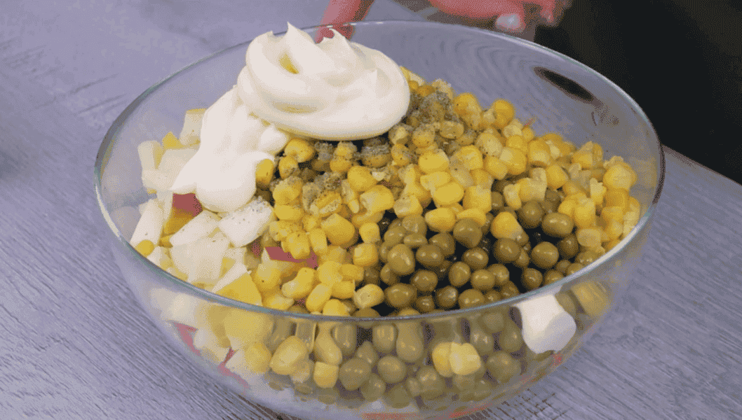 - Складаємо все в салатник. Додаємо пів банки горошку та пів банки кукурудзи.
