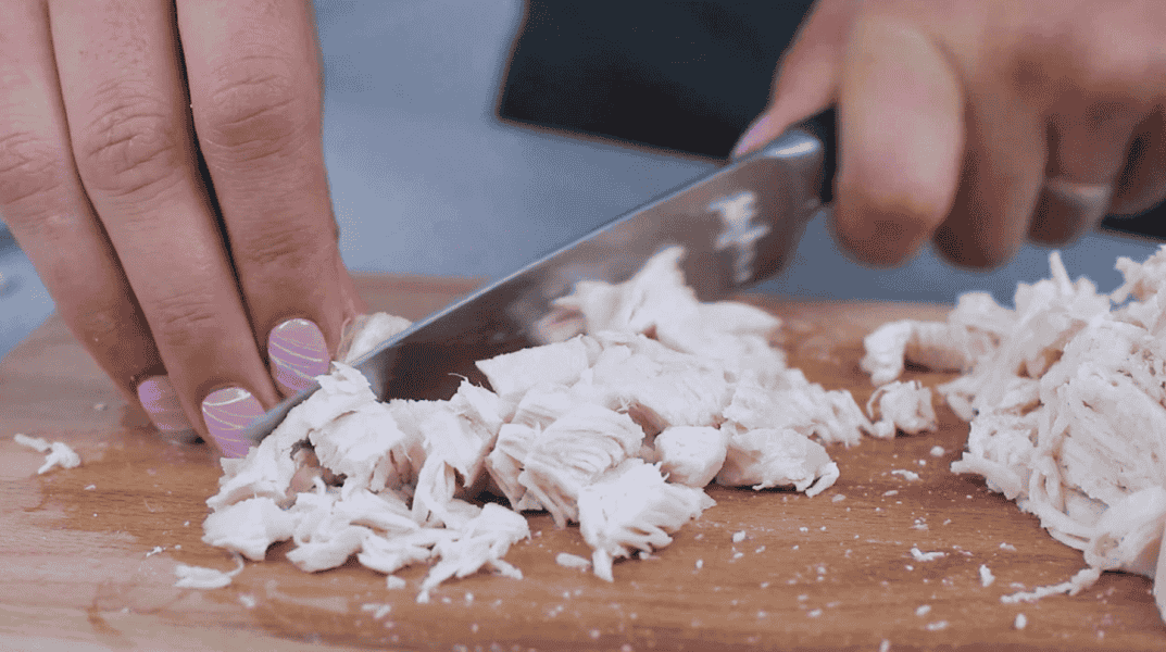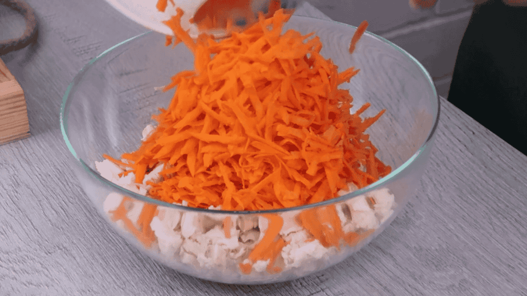 - Нарізаємо соломкою 300 г відвареного м’яса. Підійде будь-яке не жирне.