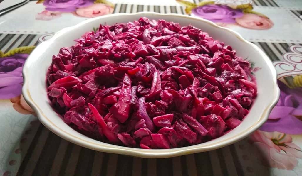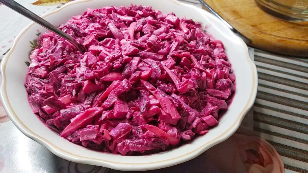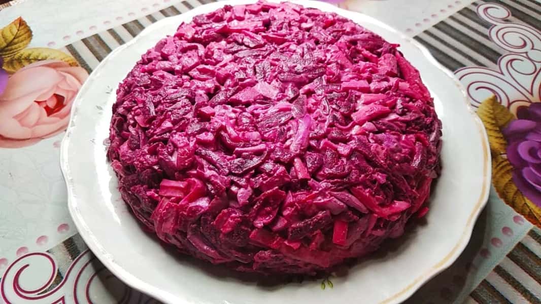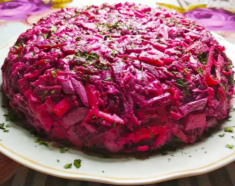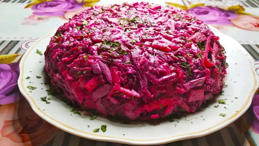 Салат “Рожевий фламінго” можна подати просто в салатнику або надати форму за допомогою кулінарного кільця.