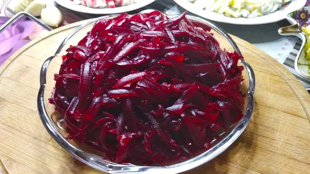 Буряк заздалегідь відваріть, остудіть, очистіть від шкірки, потім натріть на великій терці.
