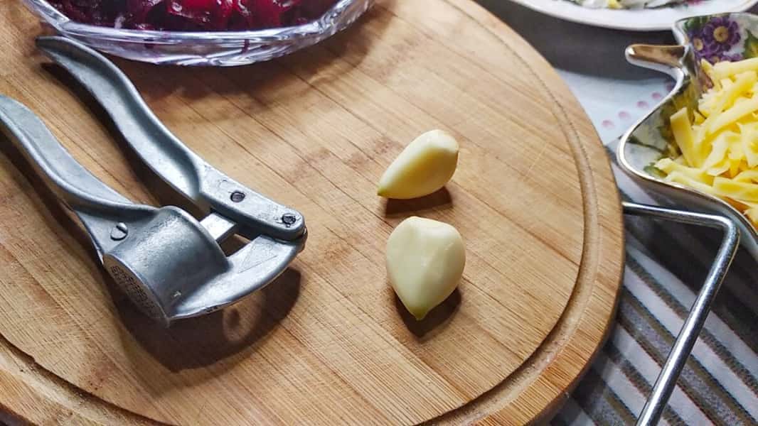 Очищені зубчики часнику пропустіть через прес або натріть на дрібній терці.