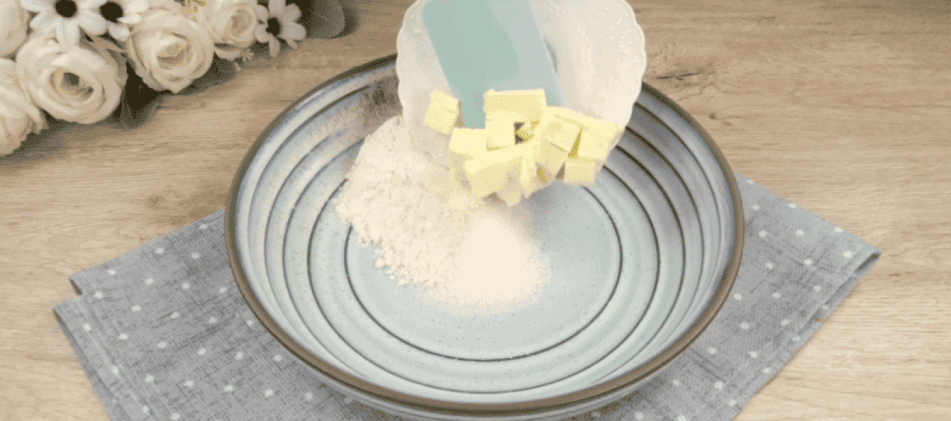 Готую посипання. Висиплю в тарілку цукор, борошно, додаю вершкове масло. Перетираю руками в крихту.