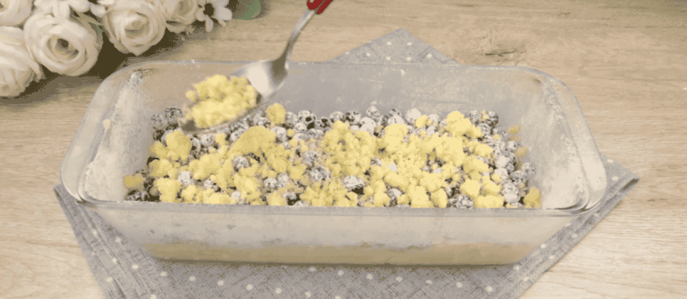 Змішую заморожену чорну смородину із 1 ч. л. крохмалю і висипаю смородину у форму. Зверху додаю підготовлену крихту.