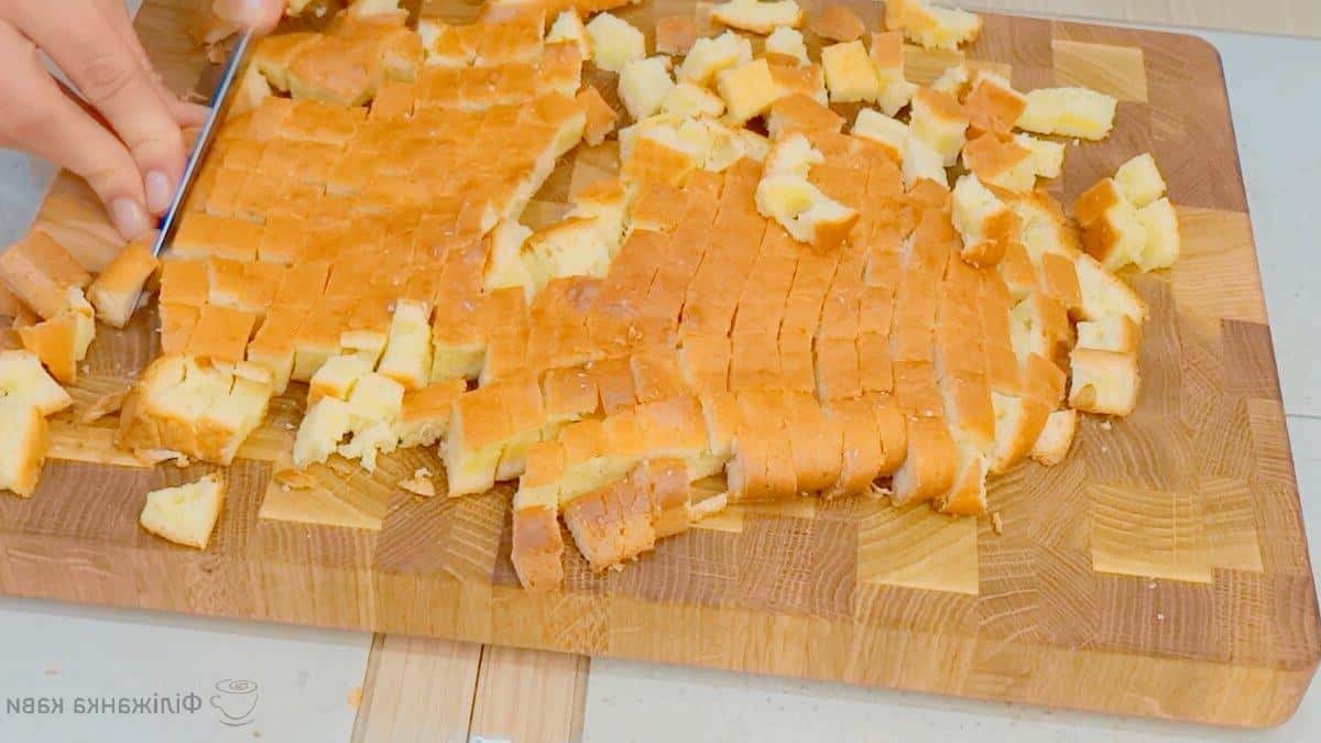 Беремо готовий корж і ріжемо кубиком 1Х1 см. Можна самим приготувати при бажанні, а можна поставити в десерт готове бісквітне печиво. Як приготувати корж я думаю немає сенсу ще раз описувати.