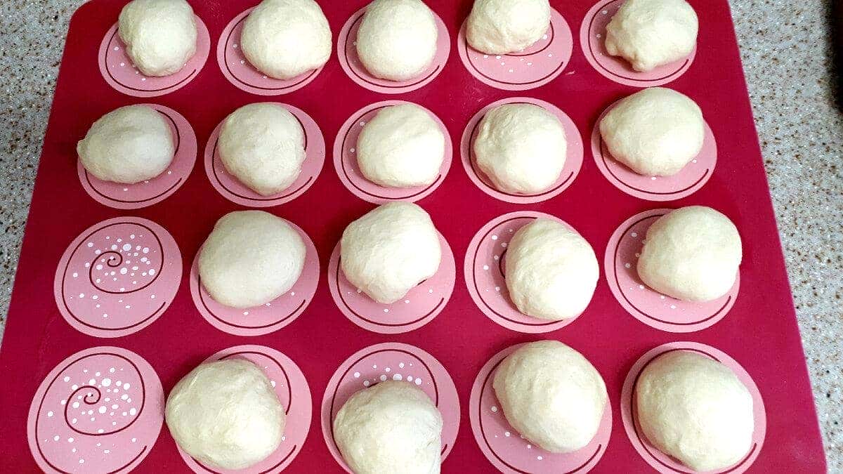 Далі тісто ще раз обминаємо, ділимо на рівні кульки, розгортаємо плоскі кружечки товщиною трохи більше сантиметра.