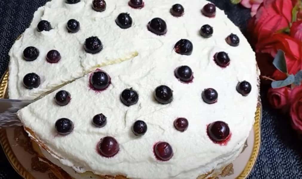Таким чином формуємо торт до верху, краї також промазуємо кремом. Розподіляємо вишню на останній шар, даємо торту стабілізуватись і можна подавати його до столу.