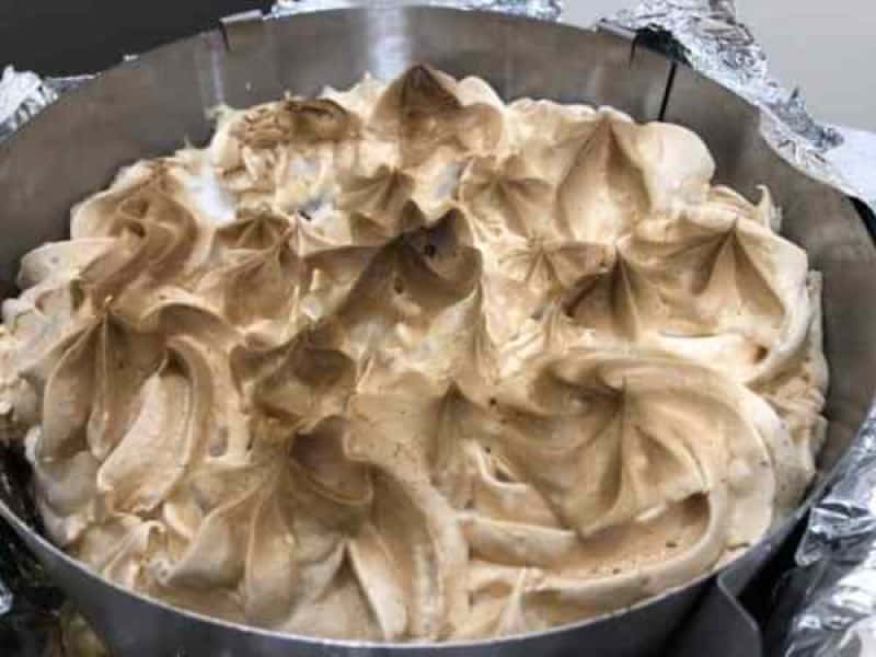 Пиріг покриваємо білками, я робила кондитерською насадкою, можна просто викласти ложкою. І відправляємо ще у духовку на 30-40 хв.