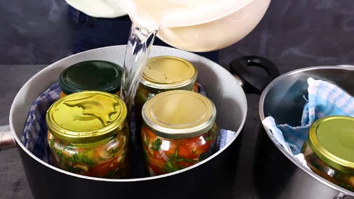 Закрийте кришками та стерилізуйте 35 хвилин на невеликому вогні. На дно каструлі обов’язково покладіть ганчірочку.