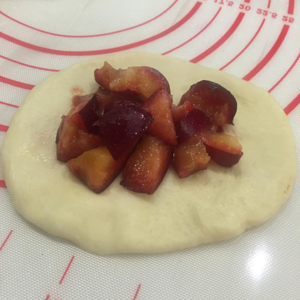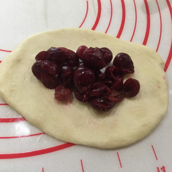 Вишню без кісточок відкинути на друшляк, віджати зайвий сік, змішати в піалі цукор з крохмалем 3:1 (наприклад, 3 ложки цукру та 1 ложка крохмалю). На розкатане тісто в центр викласти цукор із крохмалем та зверху вишню.