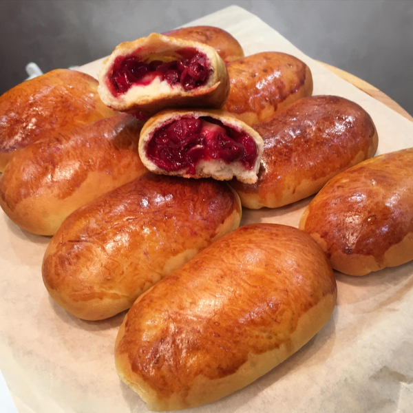 Щільно защипуємо пиріжок і проходимо по шву кілька разів, шов буде внизу. За кількістю цукру орієнтуйтеся на кислоту вишні, тісто ледь солодке. Якщо боїтеся, що начинка потече – проваріть вишню з цукром до випаровування зайвої вологи і додайте трохи крохмалю, охолодіть і готове! Така начинка безпрограшний варіант!