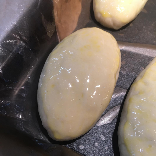 Після закінчення залишити пиріжки хвилин на 10 і потім змастити пензликом жовтком, розмішаним з 1 ст. л. води.