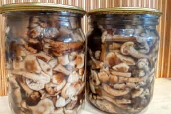 Готую маринад – додаю сіль і цукор у розрахунку на ту кількість літрів, скільки вийшло злити з банок. Ставлю на вогонь. Коли маринад закипить, розливаю його по банках, не доливаючи догори 1-2 см. Ставлю банки стерилізувати в теплу воду на 15 хвилин з моменту закипання.