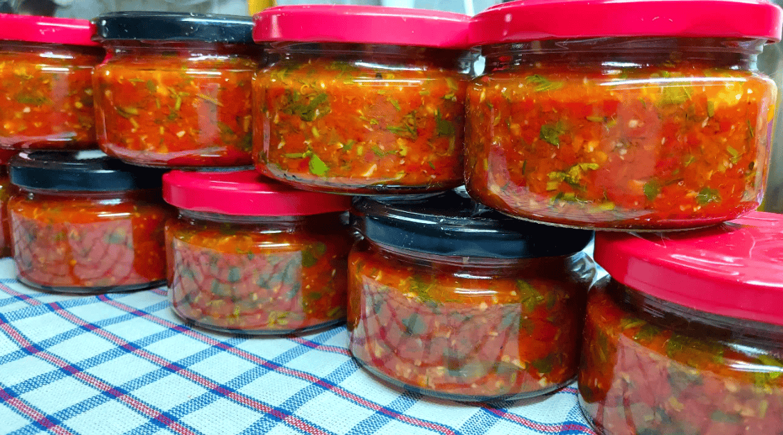 6. У чисті стерилізовані баночки розливаємо соус-аджику, закручуємо стерилізованими кришками.