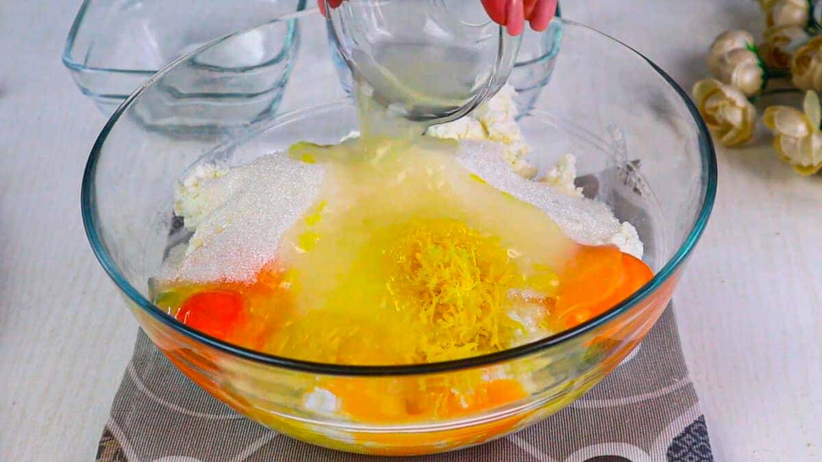 До жирного сиру 500-600 г додаємо яйця 4 шт., цукор 200 г, цедру і сік одного лимона. Все перемішуємо блендером до однорідної маси.