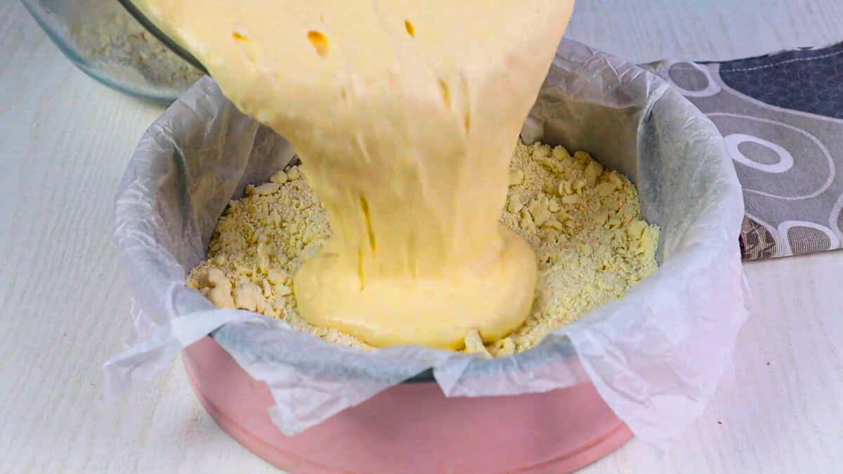 У форму ( у мене 24 см ) з пергаментом викладаємо половину крихти, виливаємо начинку.