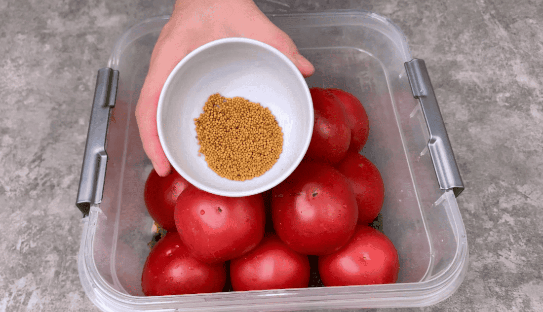 2. Максимально щільно укладаємо помідори та присипаємо зерновою гірчицею.