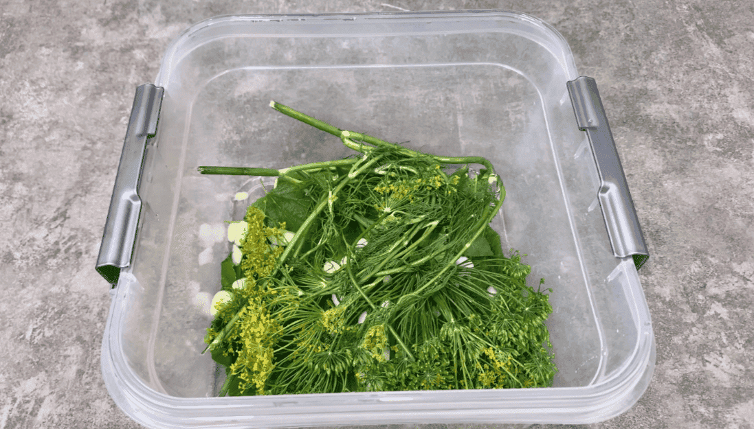 3. Зверху, знову укладаємо листя смородини, вишні, пластини часнику, чорний перець горошком і парасольки кропу.