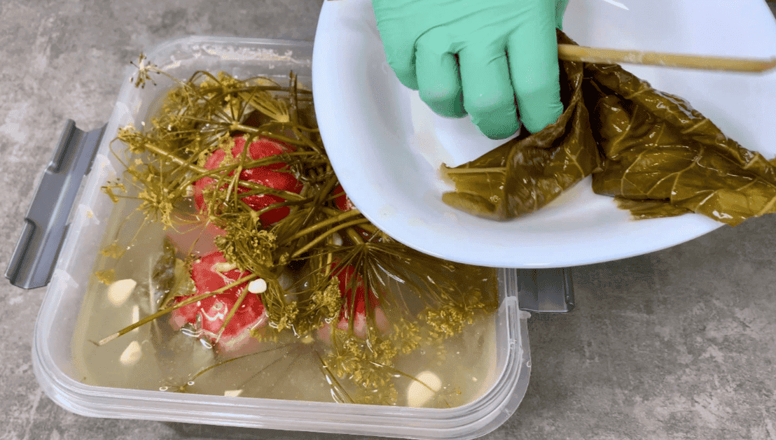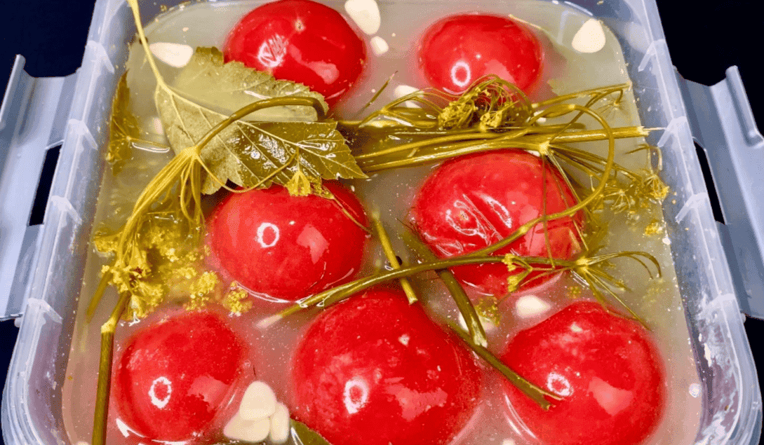6. Через 7 днів відкриваємо ємність, прибираємо “захисний” шар із листя хрону і можна відразу ж знімати пробу, помідори повністю готові.