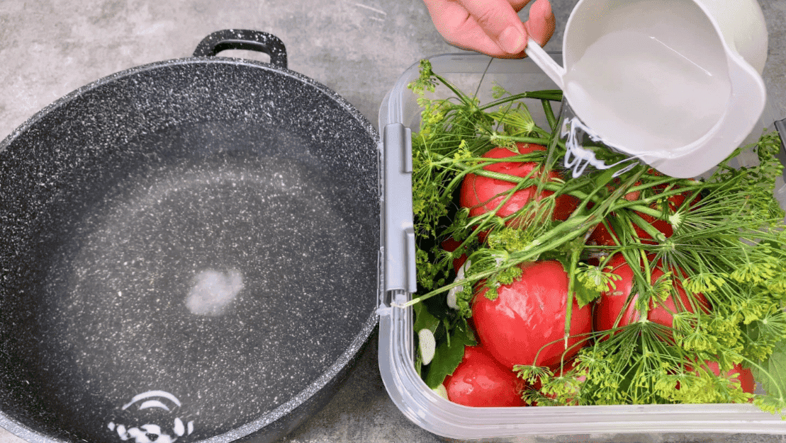 4. У холодній питній воді розчиняємо сіль із цукром і доверху заливаємо помідори холодним розсолом,