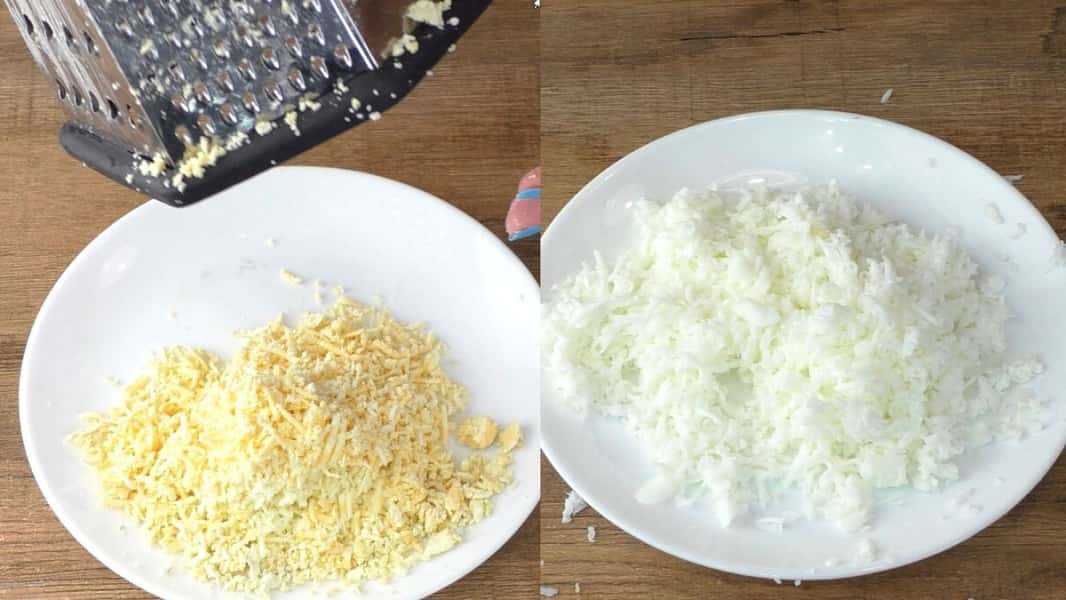 Беремо 3 відварені яйця і відокремлюємо білки від жовтків. Потім натираємо на середній тертці білки, а потім окремо жовтки.